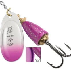 The Blue Fox Classic Vibrax is a time-honored and time-tested inline spinner from the eminent trout, salmon, and steelhead lure maker, Blue Fox. The Classic Vibrax offers a proven combination of flash and low-frequency vibration that triggers savage strikes while virtually eliminating line twist. The Vibrax Candyback Series models use a combination of three complementary color flourishes to attract fish: a colored bell accented with metallic flecks, a shiny front side of the metal blade tipped with a color that matches the bell, and a complementary fluorescent color covering the blade’s back side. These Candyback Series Vibrax are great for dirty or stained water because the colored finishes stand out better in low light than super-shiny metal ones. The pink color combinations are also great for salmon and steelhead in particular.