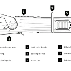 - Featuring: Spinning Line Vice, Tether Ring, Eyelet Clearing Spike, Hook Threader, Scissor Snips that can stay open to cut line while clipped, and a Split Shot Crimper.