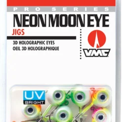 - The VMC Neon Moon Eye Jig UV Kit is an assortment of round head jigs featuring large holographic fish eyes and UV colorways.