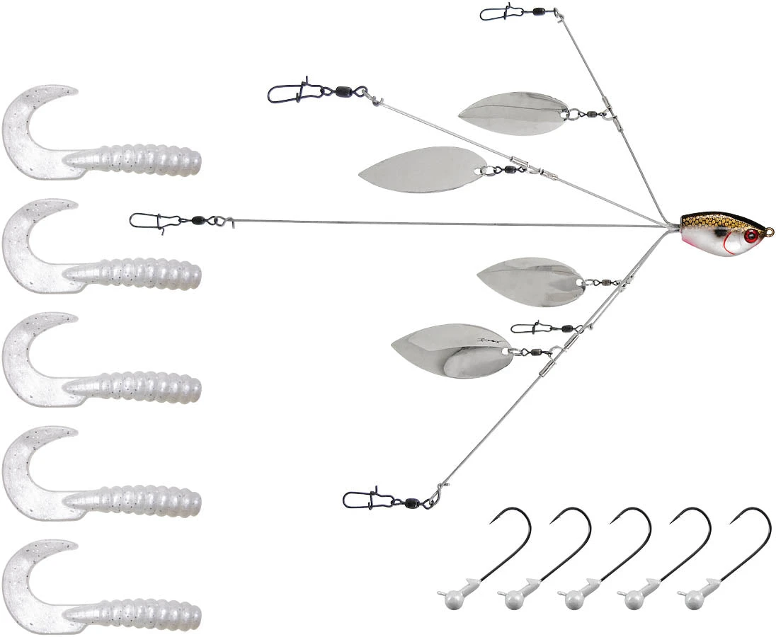 - The extra flash from the willow blades and tempting curly grub tails make this kit look like a big school of fish, and gets the hungry bass in the mood for gorging.